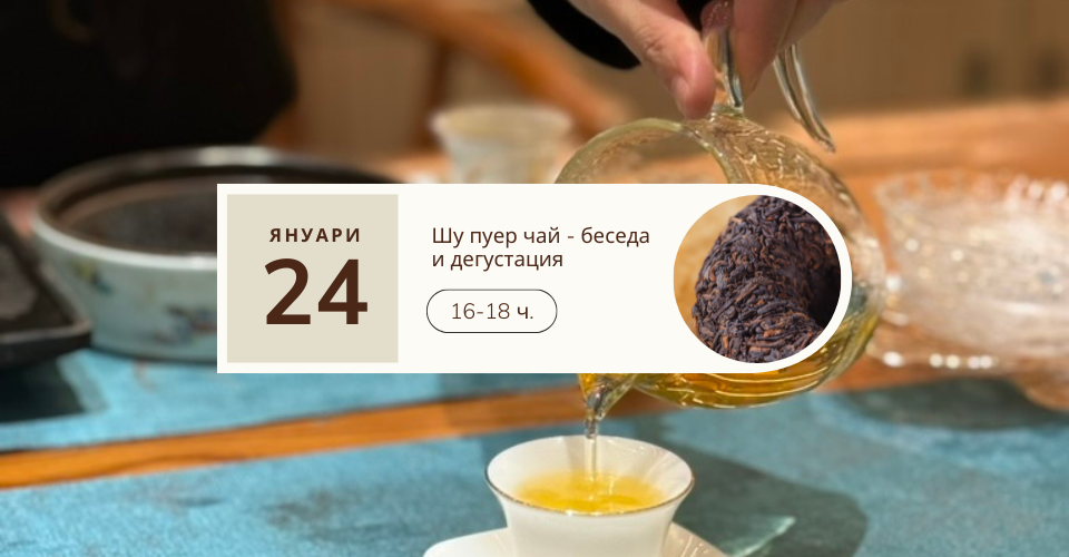 Събота 24.01 от 16:00 ч. сте поканени на тематична среща на Шу Пуер – отлежал ферментирал чай, богат на пробиотици, фунги и други полезни за чревната флора нутриенти. Ще опитаме 2 уникални по рода си Шу Пуер чая от древни чаени дървета от различни региони на провинция Юнан.